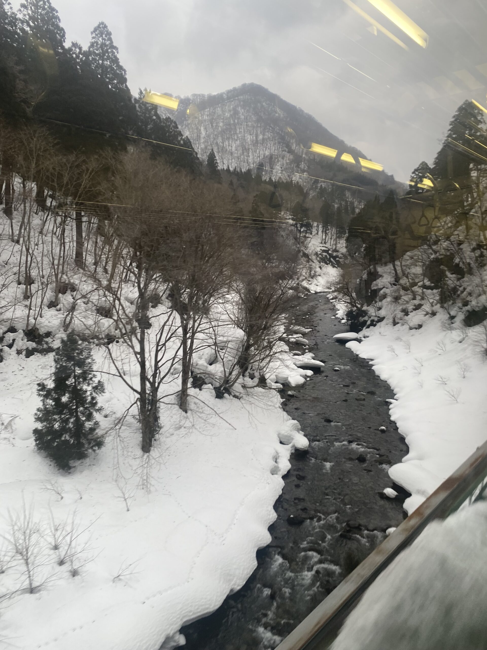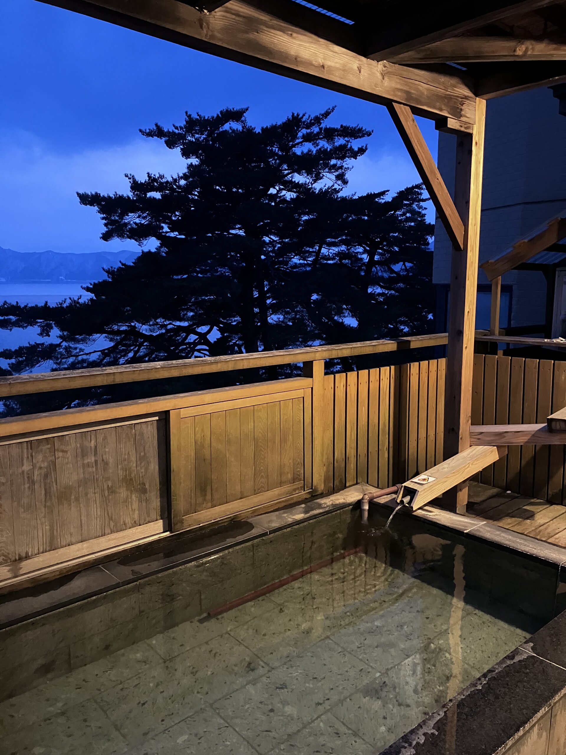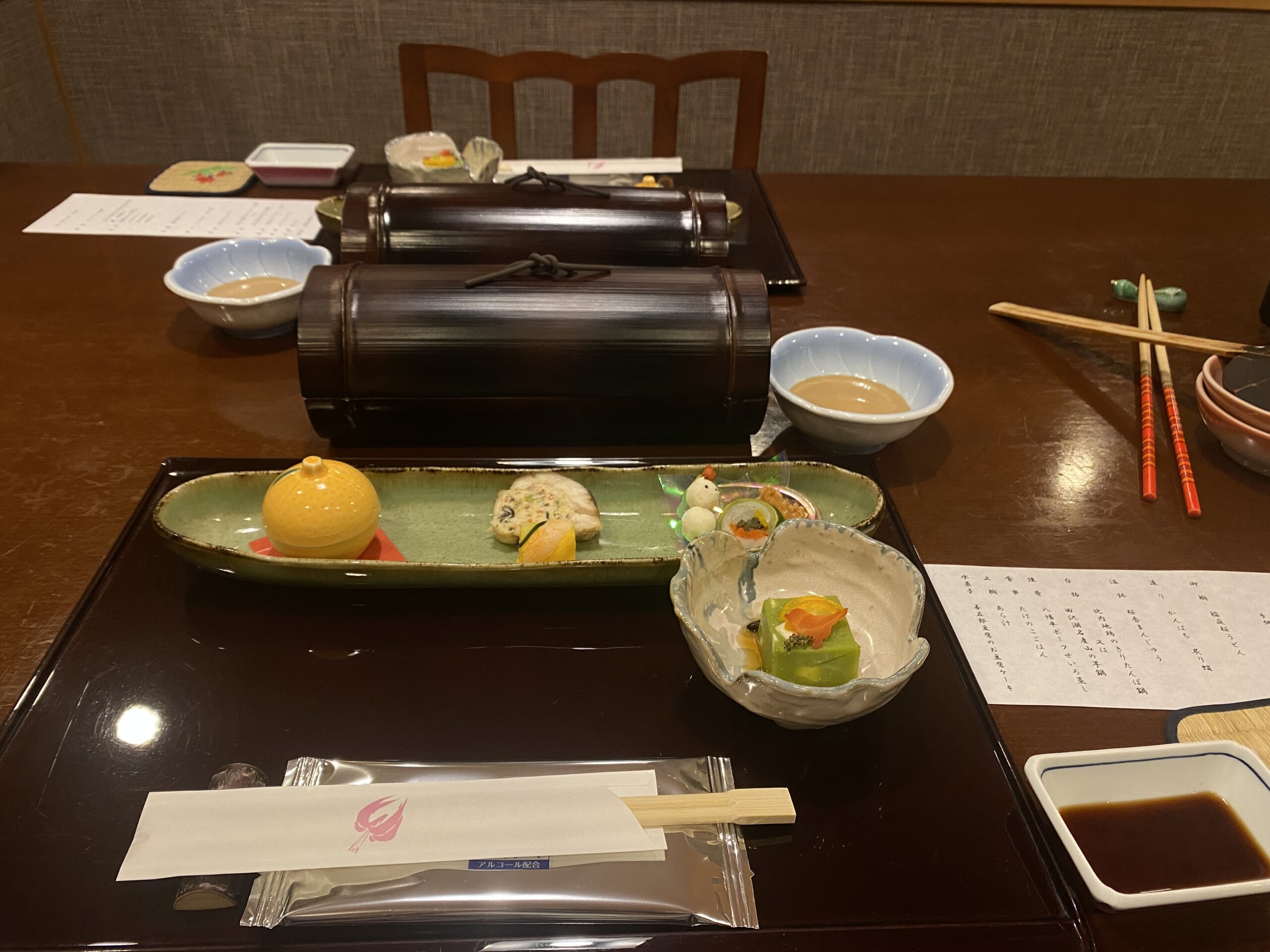 La fin de cette journée fut un trajet vers l’ouest afin de rejoindre la préfecture d’Akita et notre ryokan bordant le lac Tazawa. Un trajet en train absolument magnifique, car traversant des forêts montagneuses plongées sous la neige. Comble du bonheur, à notre arrivée, nous avons pu profiter du rotenburo (onsen extérieur), qui donnait sur le lac, avec une fenêtre en bois permettant d’admirer la vue depuis le bassin. Puis, comme dans tout ryokan, vous savez qu’un excellent dîner vous attend à la suite de ce divin bain. Ce dîner fut particulièrement incroyable, chaque plat sublimant le précédent et mettant plus qu’à l’honneur les produits de la région. Ce fut une véritable avalanche de découvertes gustatives ! Pour couronner le tout, j’y ai découvert ce que je pense être l’un de mes nihonshū (sakés) préférés. Parfaitement marié aux différents mets du soir, car sec, avec de fortes touches florales et épicées — bref, un vrai coup de cœur !