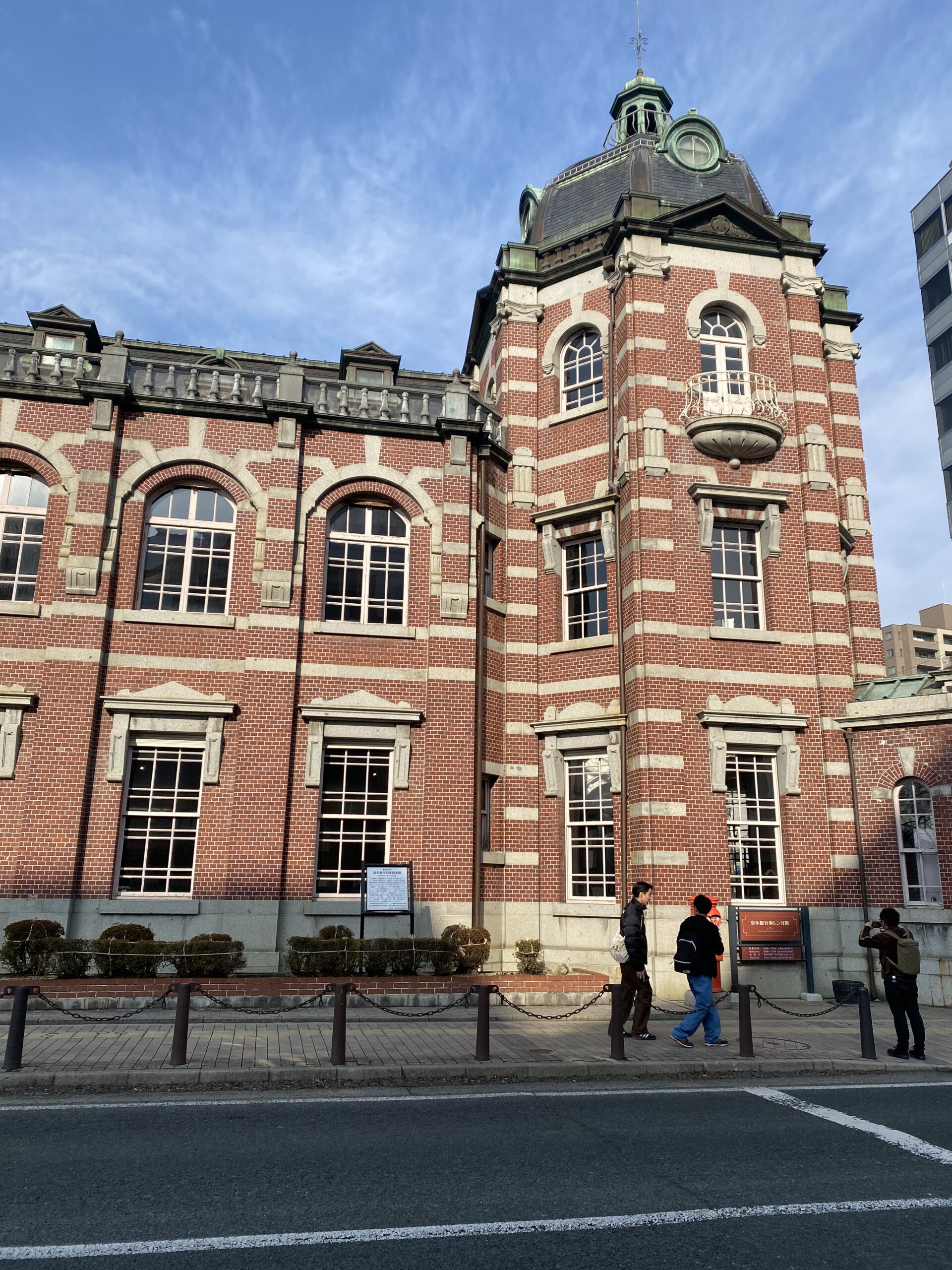 Avec Grégoire, nous sommes partis sur un week-end dans le Tōhoku (littéralement « nord-est » en japonais), seconde chance donc pour moi de parcourir cette région après ma mésaventure de janvier. Nous avons donc débuté par la ville de Morioka, capitale de la préfecture d’Iwate. Cette ville a connu un véritable essor avec le début de l’ère Meiji. Nous sommes notamment passés par l’un des bâtiments emblématiques de la ville, la banque historique. Cette banque est un parfait exemple architectural de l’ère Meiji. Elle fut d’ailleurs fondée en 1911, avant la fin de cette ère dite « Meiji », avant de mettre la clé sous la porte en 1933 suite aux conséquences du krach boursier de 1929. Pour rappel, l’histoire japonaise est souvent divisée en ères, selon les règnes des empereurs. Ainsi, l’ère Meiji est nommée d’après le nom posthume de l’empereur qui a régné entre 1868 et 1912, et signifie « gouvernement éclairé », car c’est sous ce gouvernement que le Japon se réouvre au monde et qu’il y a une réelle restauration de l’Empire japonais. Pour en revenir au bâtiment dont je vous parlais, il sera, après la faillite de la banque qui l’avait construit, acquis par la préfecture pour en faire le siège de sa banque régionale.