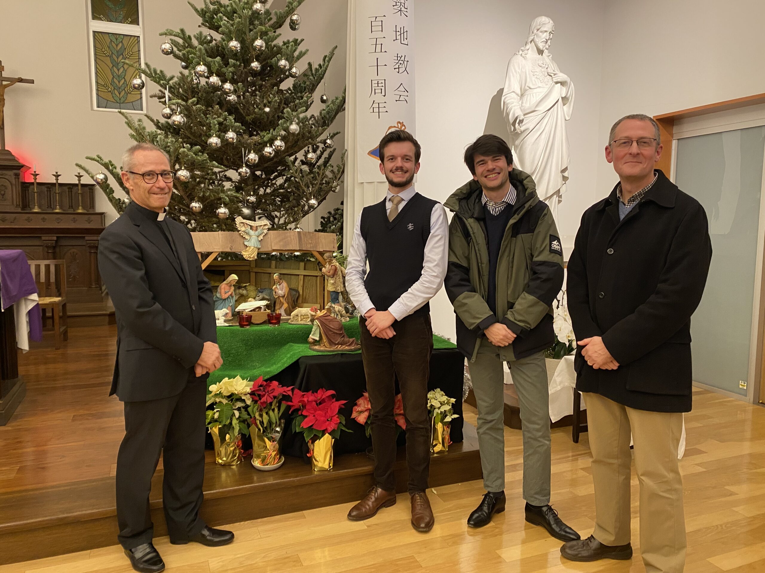 Nous avons pu fêter Noël au Japon : de gauche à droite, monsieur l’abbé, arrivé à Tokyo presque en même temps que moi, Colin que vous connaissez déjà, et Jean-François, qui aide à la vie de la paroisse.
